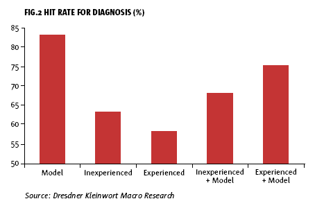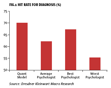 In 1968, Lewis Goldberg1 obtained access to more than 1000 patients’ MMPI test responses and final diagnoses as neurotic or psychotic. He developed a simple statistical formula, based on 10 MMPI scores, to predict the final diagnosis. His model was roughly 70% accurate when applied out of sample. Goldberg then gave MMPI scores to experienced and inexperienced clinical psychologists and asked them to diagnose the patient. As Fig.1 shows, the simple quant rule significantly outperformed even the best of the psychologists.
