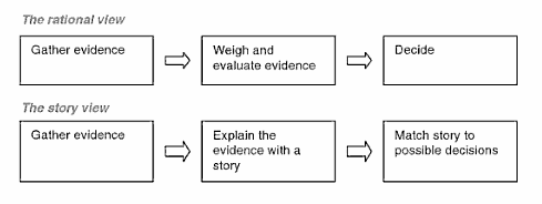 However, the real world of behaviour is a long way from the rational viewpoint, and not just in the realm of information gathering. The second stage of the rational decision is weighing the evidence. However, as the diagram below shows, a more commonly encountered approach is to construct a narrative to explain the evidence that has been gathered (the story model of thinking).