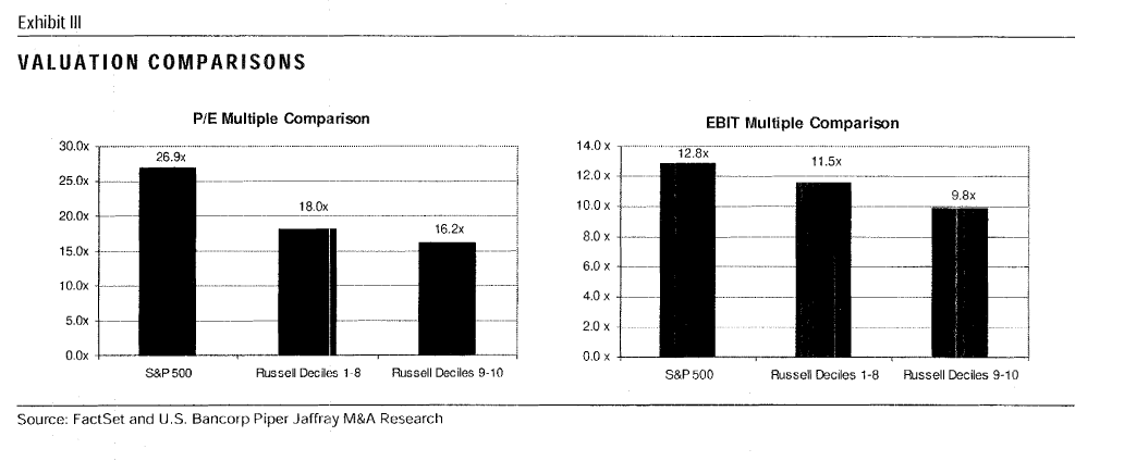 In the Spring 1999 Piper Jaffray produced a research report called Wall Street’s Endangered Species by Daniel J. Donoghue, Michael R. Murphy and Mark Buckley, then at Piper Jaffray and now at Discovery Group, a firm founded by Donoghue and Murphy (see also Performance of Darwin’s Darlings). The premise of the report was that undervalued small capitalization stocks (those with a market capitalization between $50M and $250M) lacked a competitive auction for their shares and required the emergence of a catalyst in the form of a merger or buy-out to close the value gap.