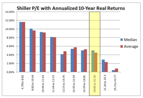 Mebane Faber has an interesting analysis of the expected ten-year annualized real returns to investors in the various Shiller / Graham P/E10 deciles: