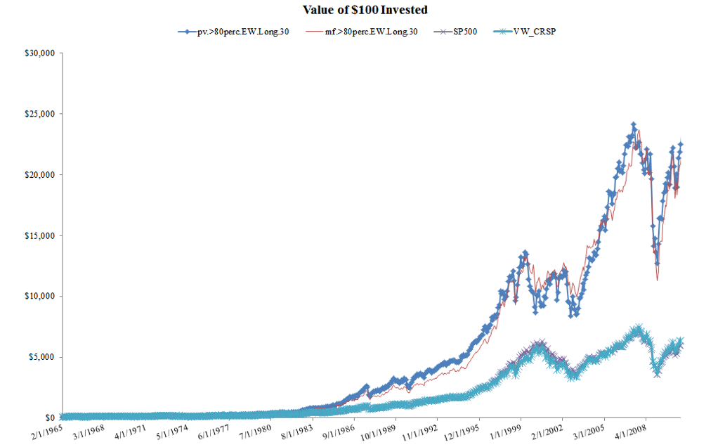 The excellent Empirical Finance Blog has a superb series of posts on an investment strategy called “Profit and Value” (How “Magic” is the Magic Formula? and The Other Side of Value), which Wes describes as the “academic version” of Joel Greenblatt’s “Magic Formula.” (Incidentally, Greenblatt is speaking at the New York Value Investors Congress in October this year. I think seeing Greenblatt alone is worth the price of admission.) The Profit and Value approach is similar to the Magic Formula in that it ranks stocks independently on “value” and “quality,” and then reranks on the combined rankings. The stock with the lowest combined ranking is the most attractive, the stock with the next lowest combined ranking the next most attractive, and so on.