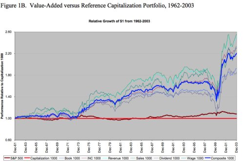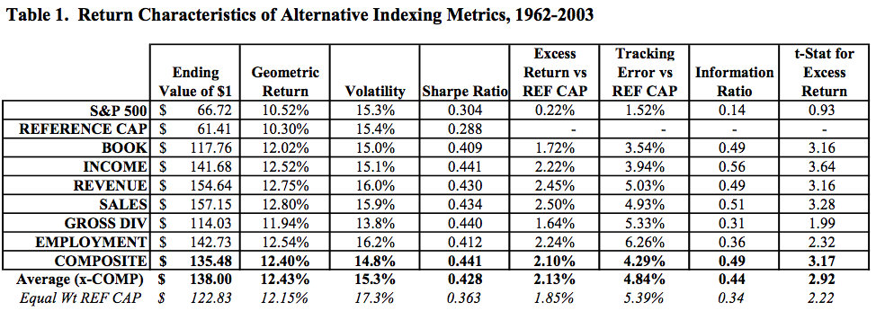 Note that the “Reference Capitalization index” is a 1000-stock capitalization-weighted equity market index that bears close resemblance to the highly regarded Russell 1000, although it is not identical. The construction of the Reference Capitalization index allows Arnott et al to “make direct comparisons with the Fundamental Indexes uncomplicated by questions of float, market impact, subjective selections, and so forth.”