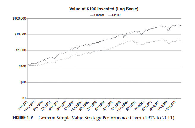 Figure 1.2 below taken from our book shows the cumulative performance of Graham’s simple value strategy plotted against the performance of the S&P 500 for the period 1976 to 2011: