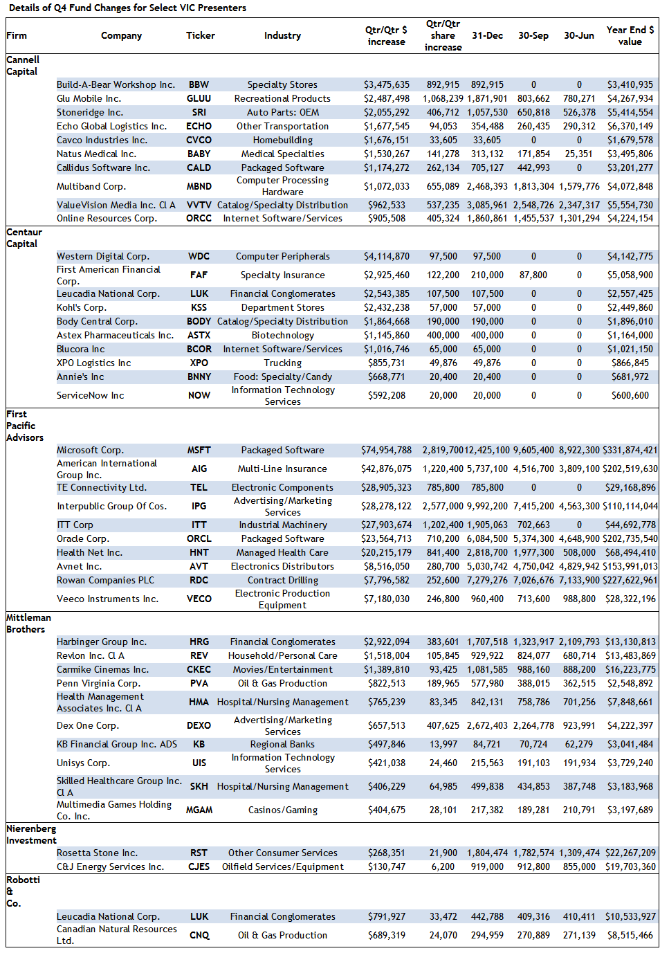 Briefing.com has provided a fantastic spreadsheet showing a few of the changes in the portfolios of several notable presenters at this spring’s Value Investing Congress. (Click to enlarge.)