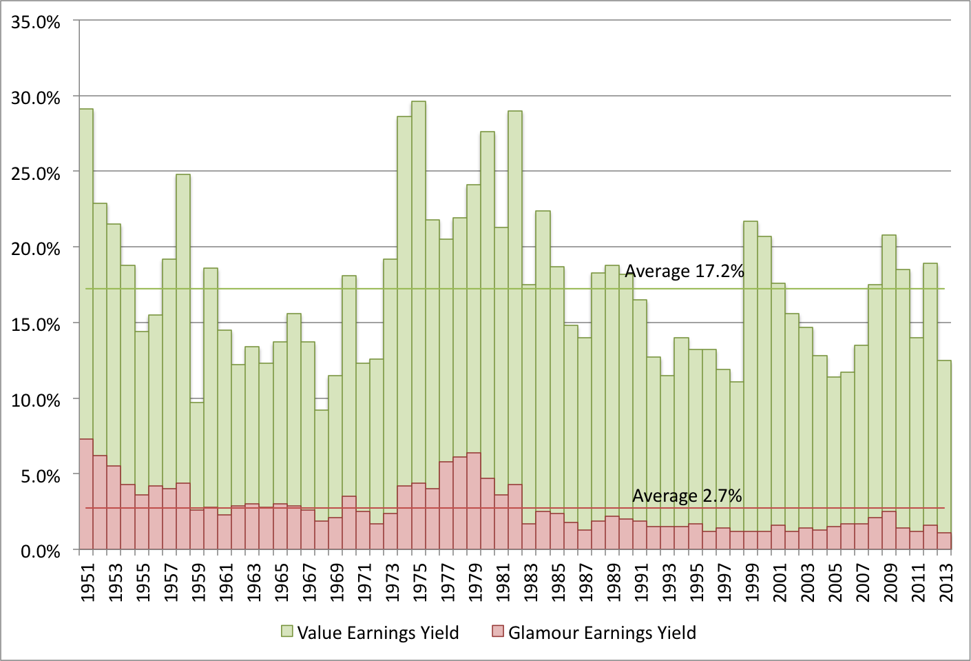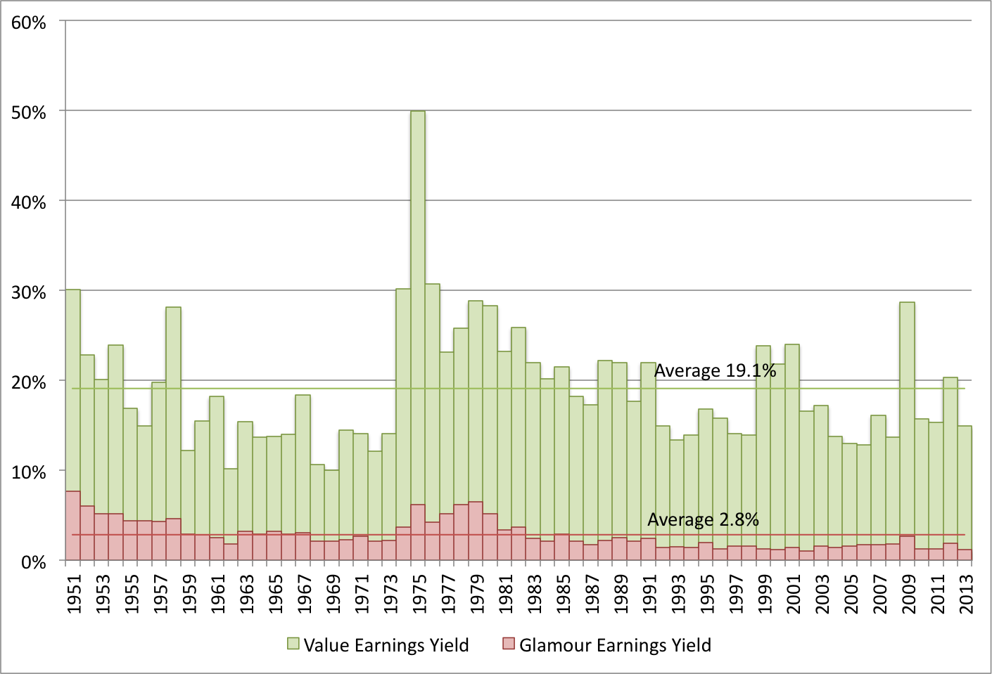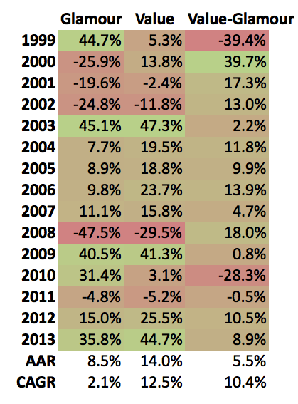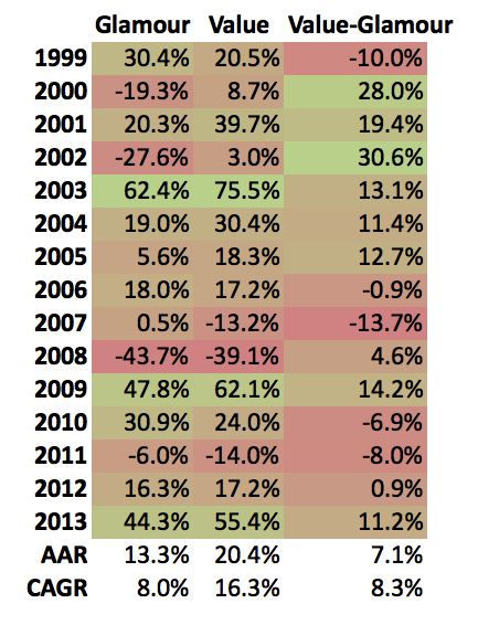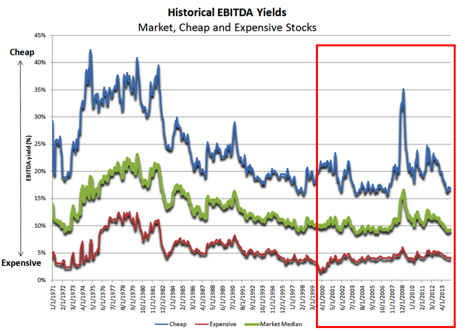 Many value investors regard the period since the beginning of 2008 as a difficult one for value strategies. After the bonanza for value in the early 2000s, when a number of value guys made their name, the going has been much tougher in the latter part of the 2000s, and early 2010s. One theory for the lower performance of value–the one to which I subscribe–is that value stocks were much cheaper in the early 2000s than they have been since because the dot com boom was mostly restricted to big, “new economy” stocks. Smaller “old economy” stocks were neglected, and unusually good value. (For more on this, see for example, this post: Implications of All-Time-High Median Valuations).