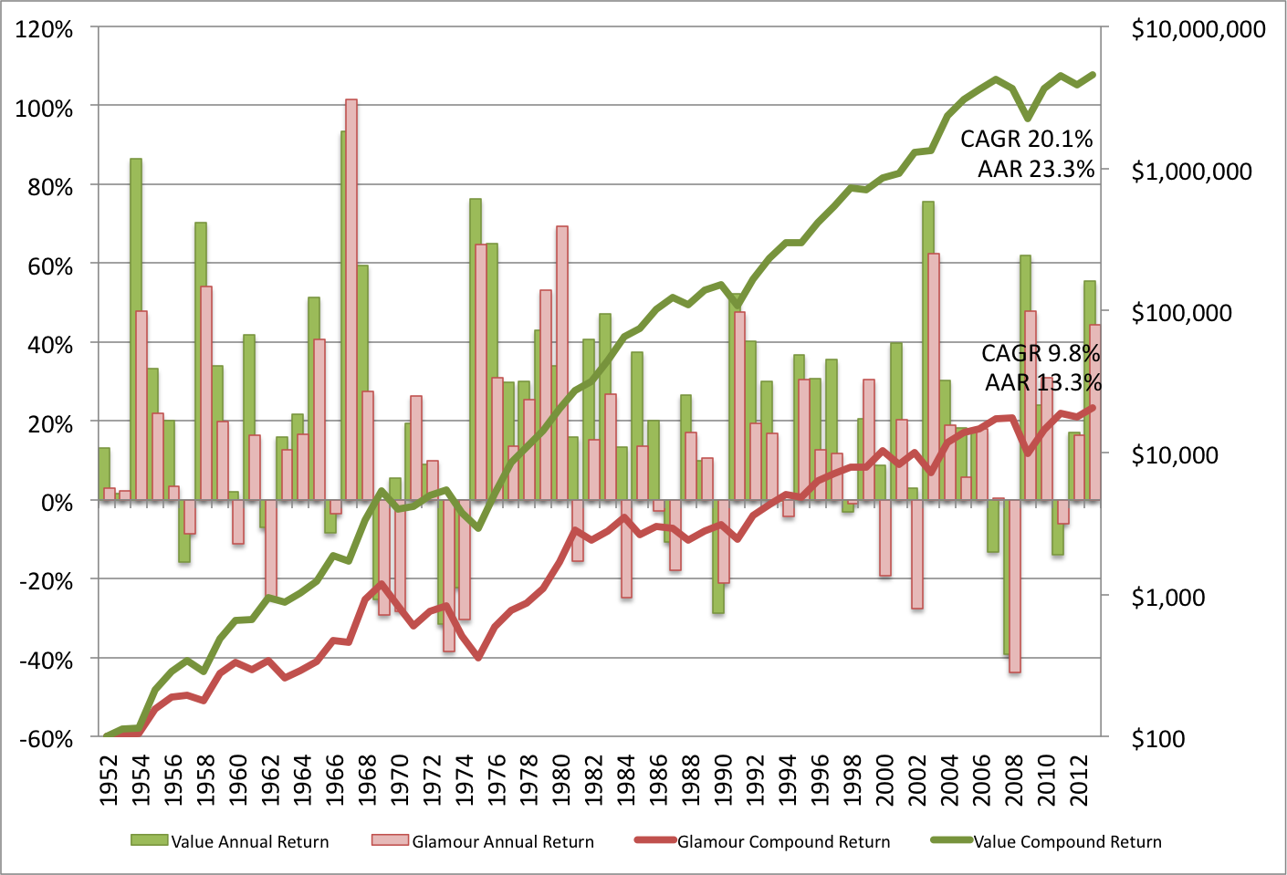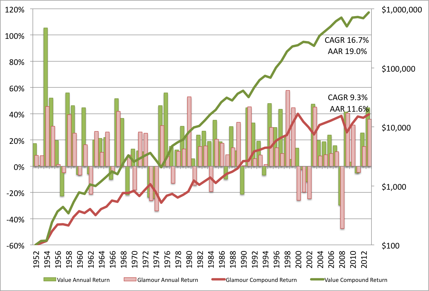 The Russell 1000 contains the largest 1000 stocks in the market. The value decile returned 19.8 percent compound over the full period, beating its corresponding index by 7.0 percent per year compound (and by 10.7 percent on average). $100,000 invested in the value decile in 2008 is worth $227,280 today, versus $151,920 for the Russell 1000. Though the value decile outperformed by a wide margin over the full period, the value decile only beat the Russell 1000 in 4 out of 7 years. When it did outperform, however, it did so by a lot: 60.2 percent in 2009 and almost 20 percent in 2013.