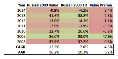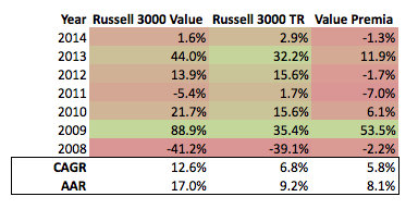 The Russell 2000 is the smallest 2000 stocks in the Russell 3000 (the same universe as the Russell 3000 excluding the largest 1000 stocks). The value decile generated 16.2 percent compound over the full period, beating the Russell 2000 by 4.5 percent per year (or 6.2 percent in the average year). $100,000 invested in the value decile in 2008 is worth $207,930 today, versus $159,990 for the Russell 2000. Again, though the value decile outperformed by a wide margin over the full period, it only beat the Russell 2000 index in 3 out of 7 years, less than half the time.