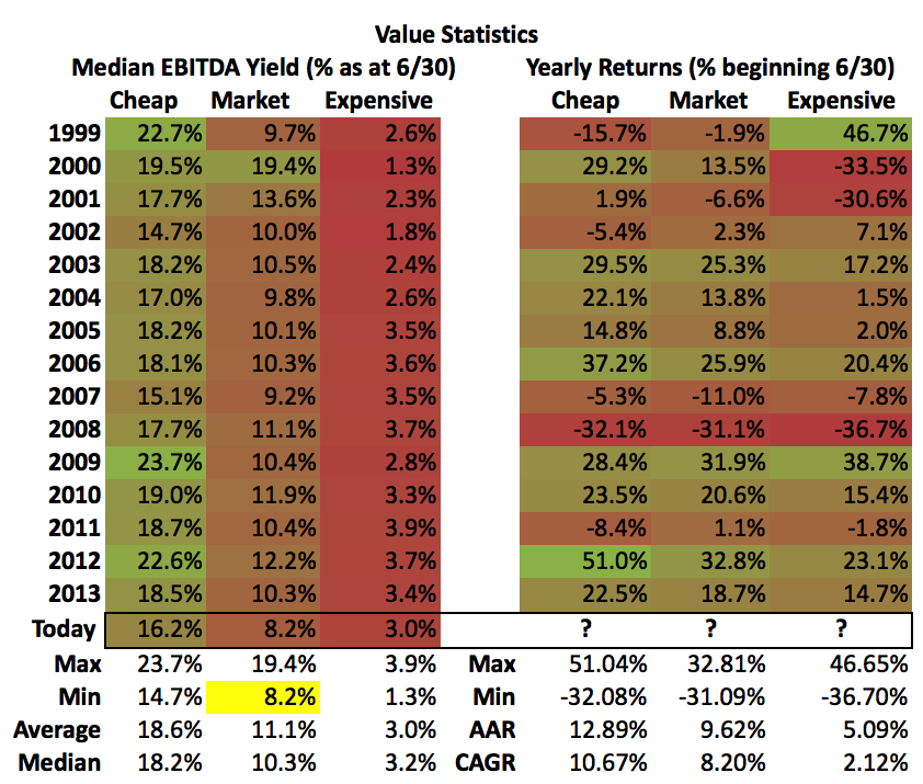 EBITDA/EV Value Deciles versus Indexes (2008 to Present)