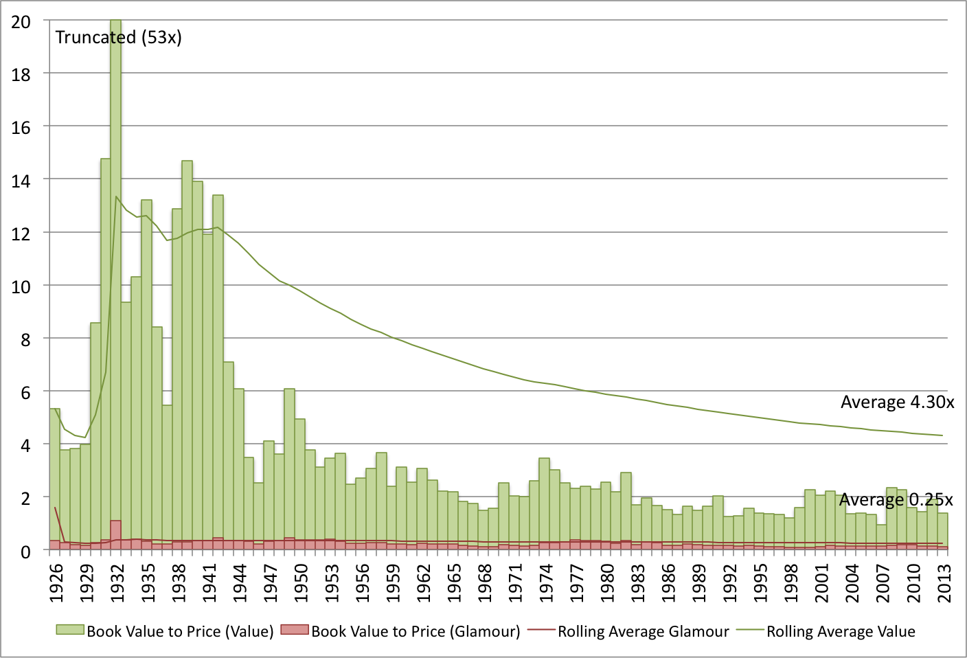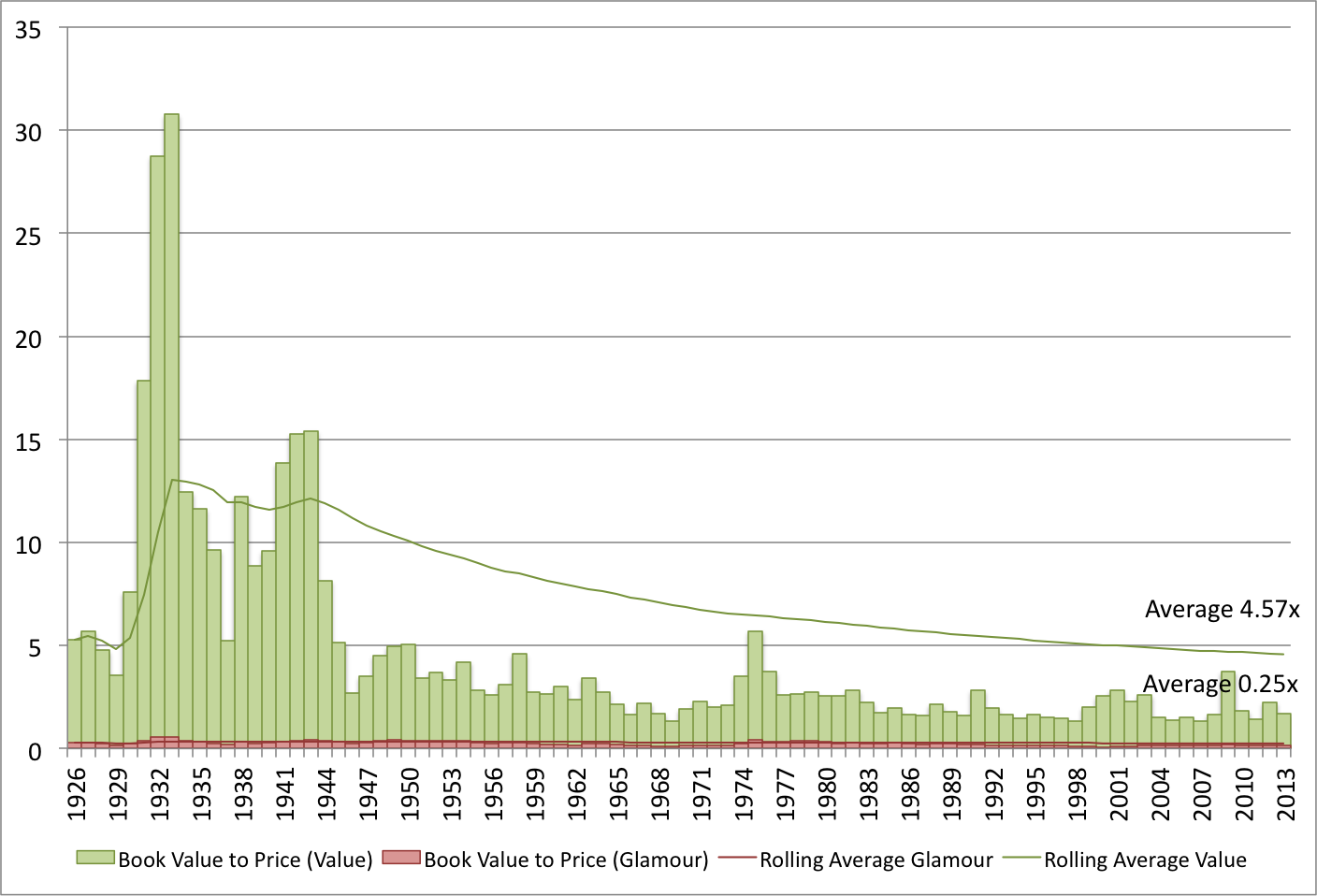 The value premium is the outperformance of the value decile over the glamour decile. This chart shows the yearly returns to each of the value and glamour deciles, the value premium (value-glamour) in each year, and the rolling average from the start of the data in 1926: