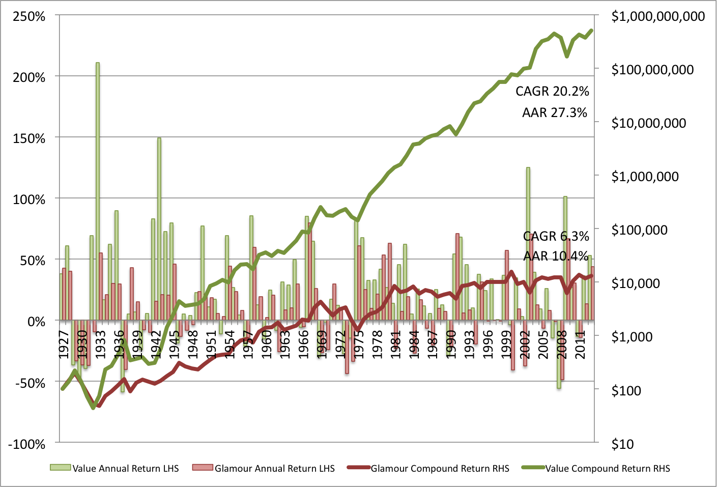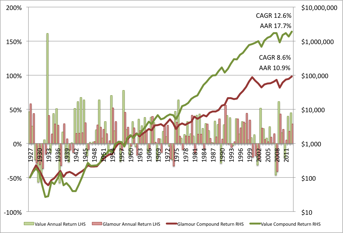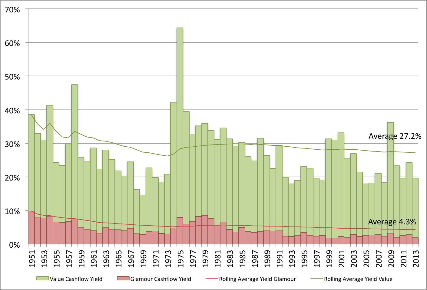 Set out below are the results of two Fama and French backtests of the dividend yield data from 1926 to 2013. As at December 2013, there were 3,393 firms in the sample. The value decile contained the 198 stocks with the highest earnings yield, and the glamour decile contained the 137 stocks with the lowest earnings yield (the deciles are smaller than 1/10th of the stocks in the sample because fully 1,894 stocks pay no dividend at all). The average size of the glamour stocks is $8.60 billion and the value stocks $3.06 billion. Portfolios are formed on June 30 and rebalanced annually.