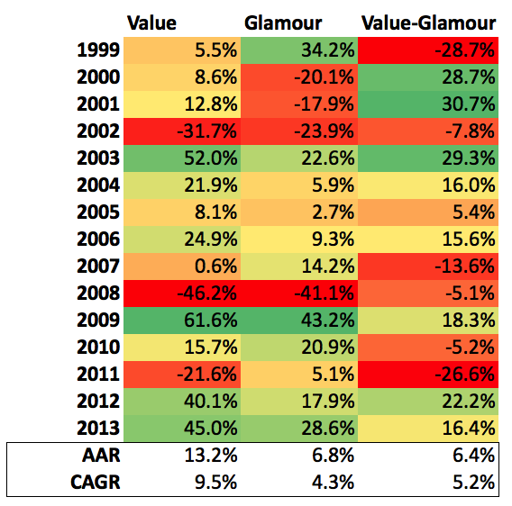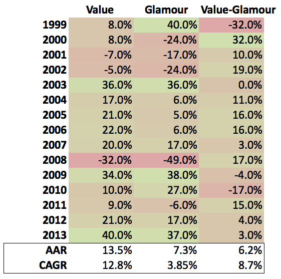 In the equal weight portfolios, value has slightly outperformed glamour since 1999, beating it by a 3.9 percent compound, and 2.8 percent in the average year.