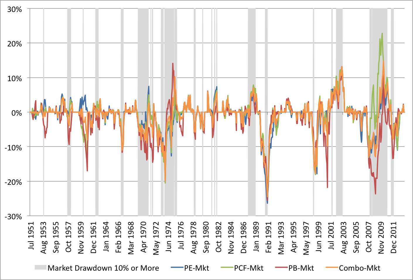 These returns are considerably lower than the returns found for the price-to-earnings and cashflow ratios over the last few weeks (see Investing Using Price-to-Book Value Ratio or Book Equity-to-Market Equity Multiple (Backtests 1926 to 2013), Investing Using the Price-to-Earnings Ratio and Earnings Yield (Backtests 1951 to 2013) and Investing Using Price-to-Cashflow Ratio and Cashflow Yield (Backtests 1951 to 2013)). The reason is that the earnings and cashflow backtests ran back to only 1951, and the dividend yield data, like the book value return data last week, begins in 1926. The difference is partly due to the 1929 crash, which had an oversized impact on returns. The crash is visible on the chart, and striking–it took almost twenty years for the value decile to fully recover.