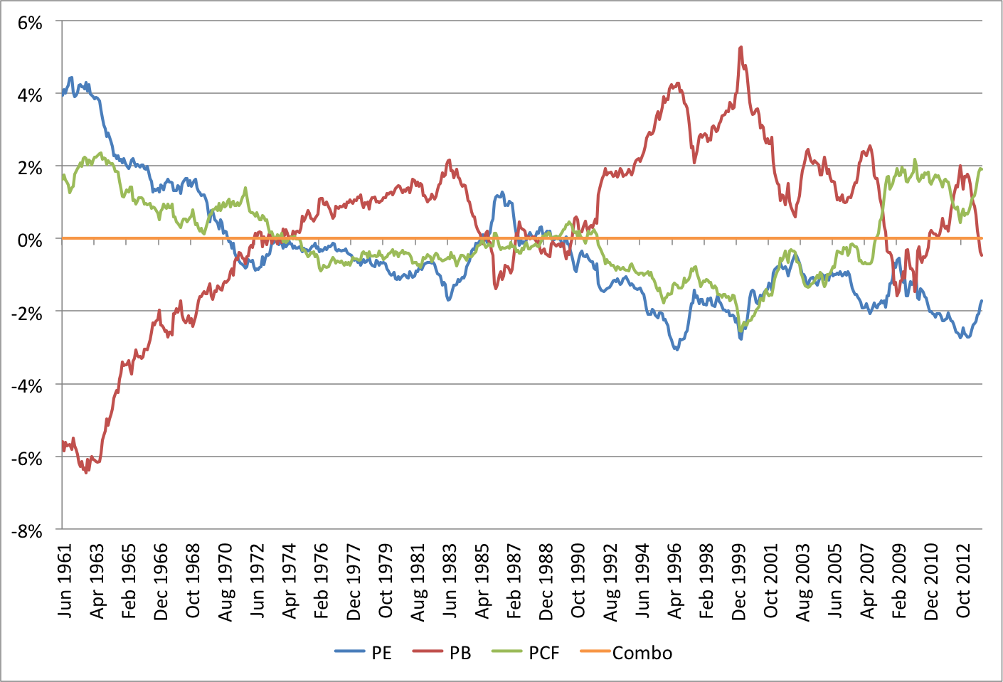 The rolling average tells a sad story for value relative to glamour: The value premium has gradually disappeared over time. Over the 73 years of data to 2000 it was actually zero, but it has slightly recovered since to be 1.8 percent compound over the full period.