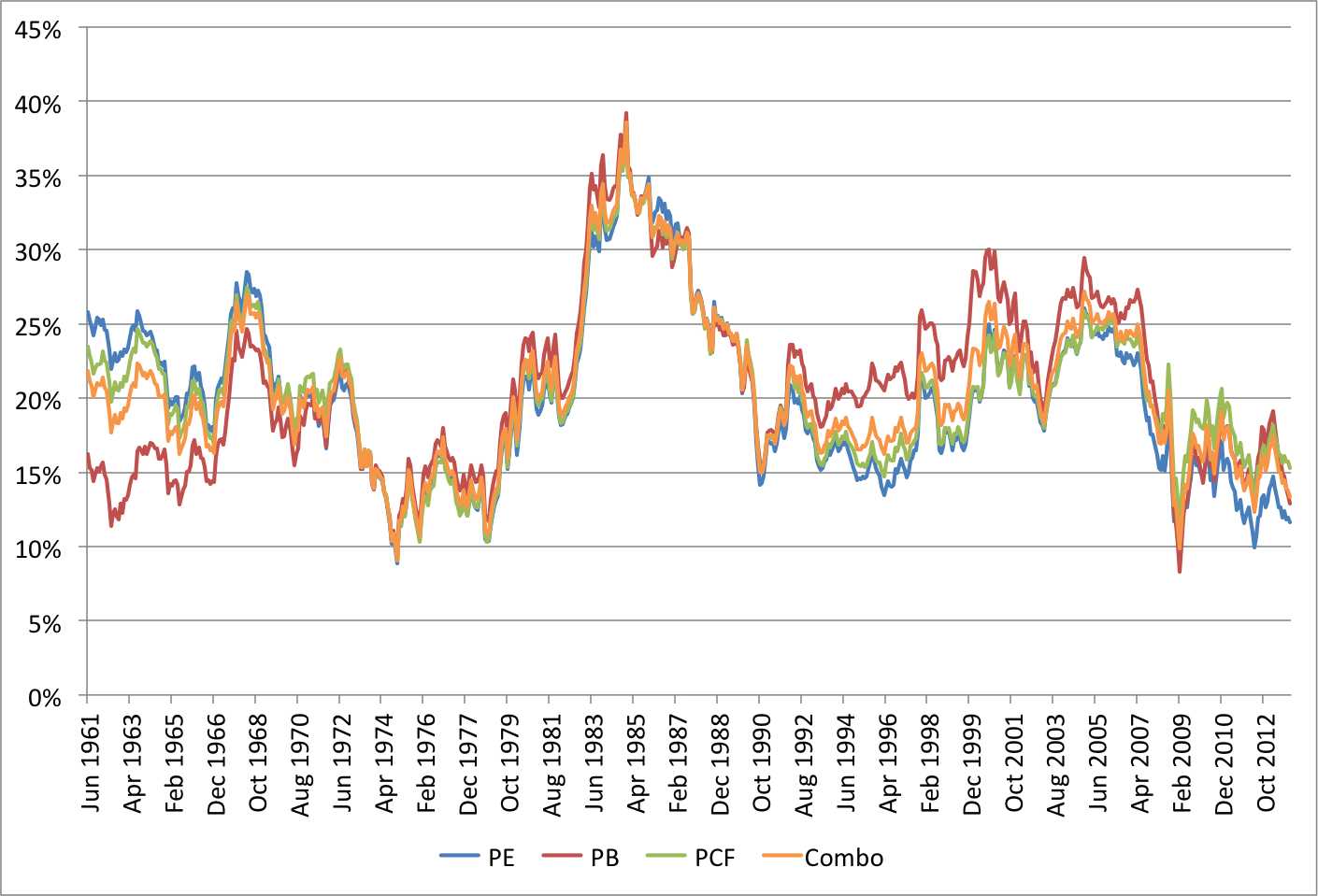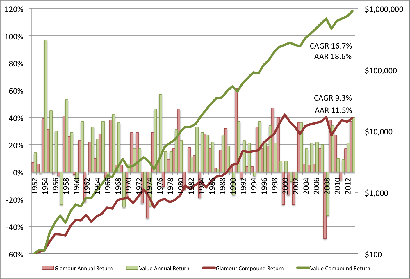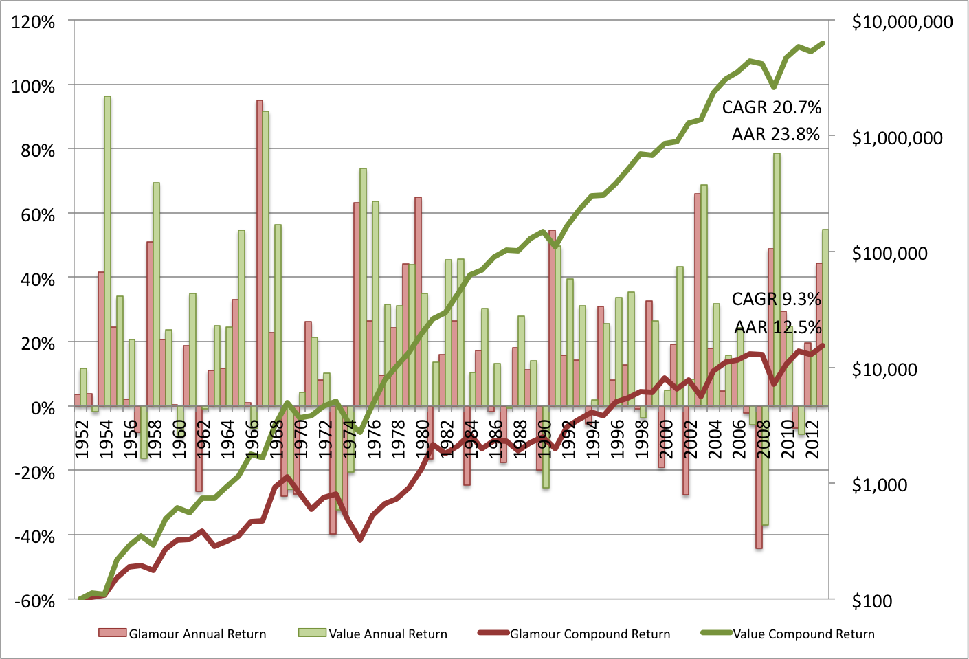 Since 1951 the equally weighted high dividend yield value decile has generated a compound annual growth rate (CAGR) of 13.5 percent and an average annual return (AAR) of 15.7 percent. Over the same period the glamour decile returned a CAGR of 12.5 percent and an AAR of 15.5 percent. These returns are still slightly lower than the returns generated by PB, PCF and PE over the same period.