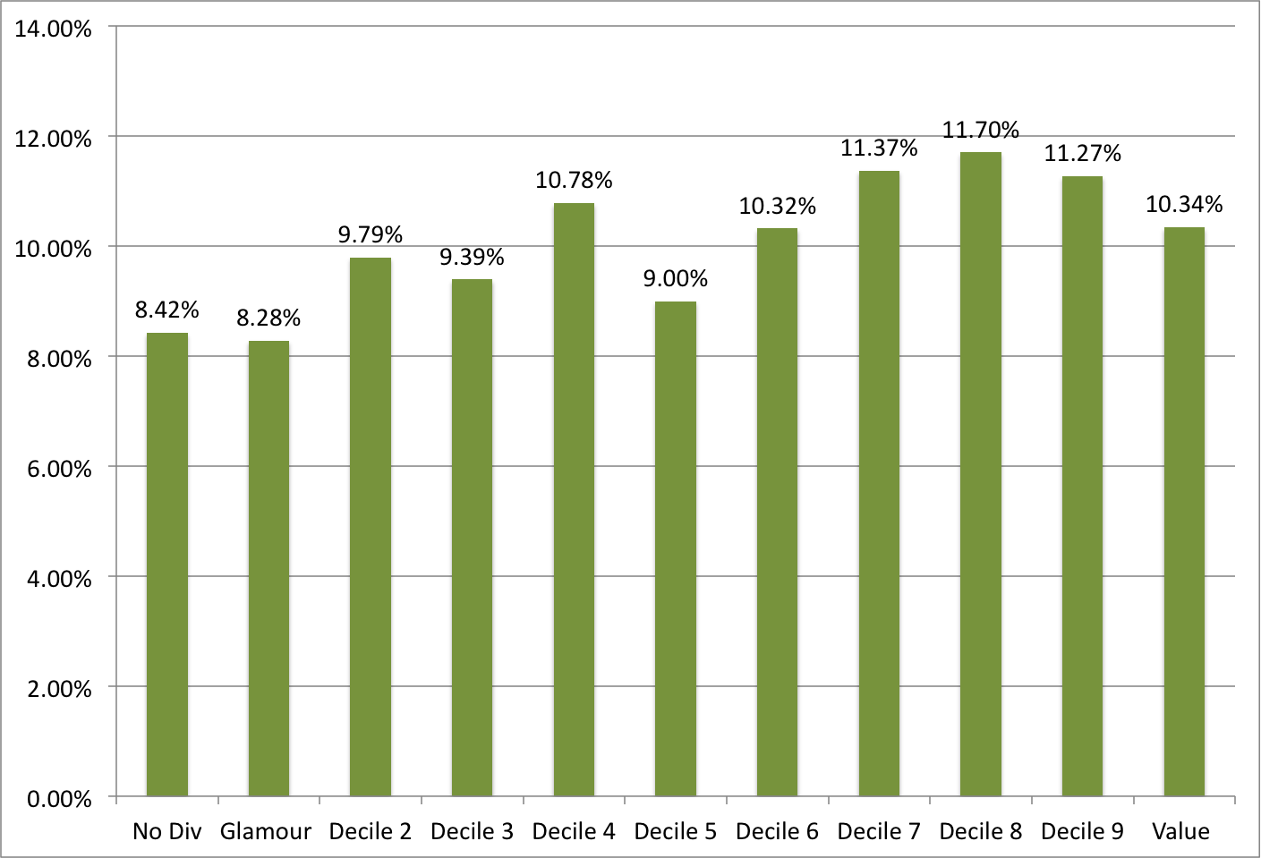 The following chart shows the returns to each of the deciles sorted by dividend yield (Updated to include non-dividend payers).