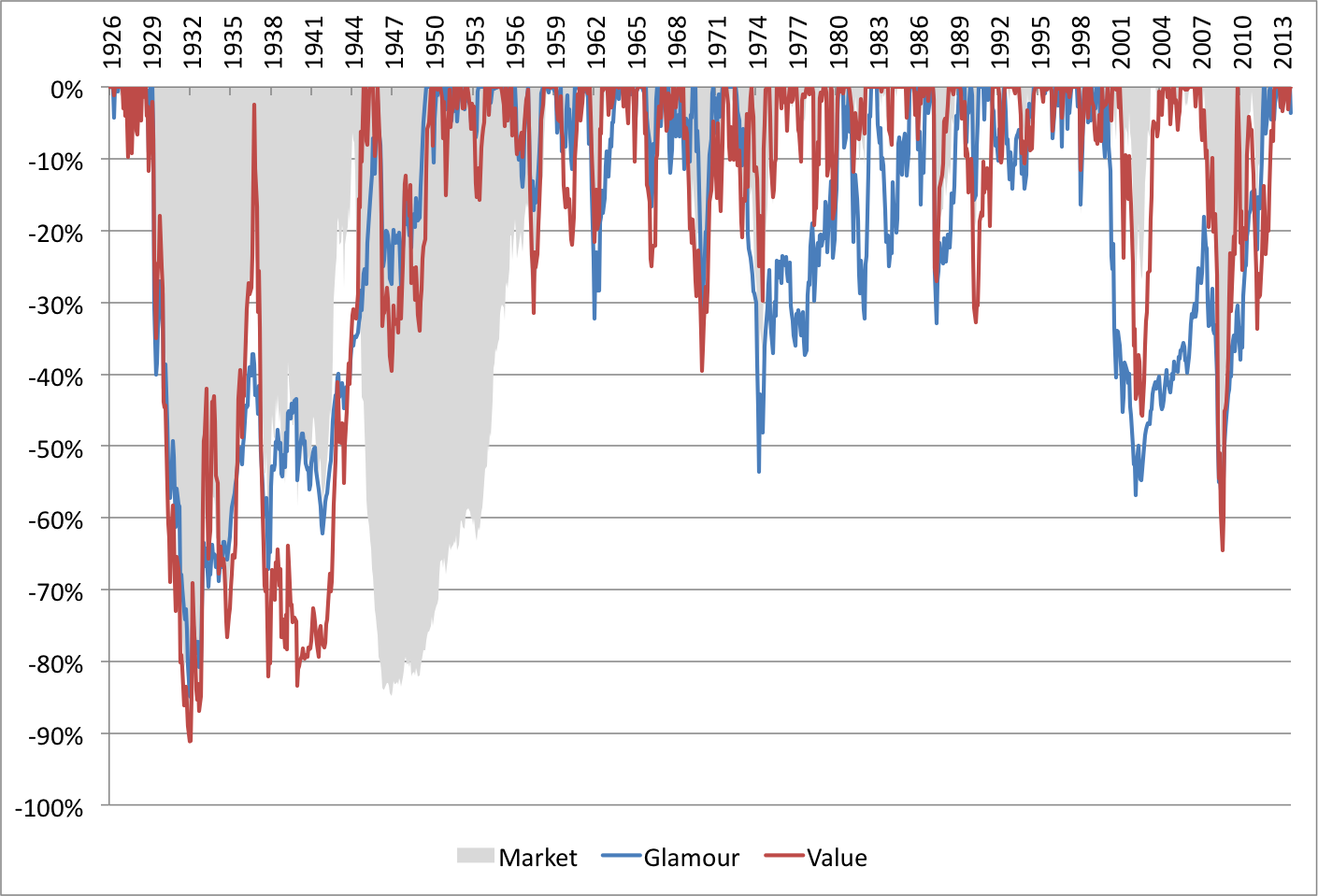 Drawdowns of Value Decile (Price-to-Book Value), Cash and 3 Shiller PE Timed Strategies (1926 to Present)