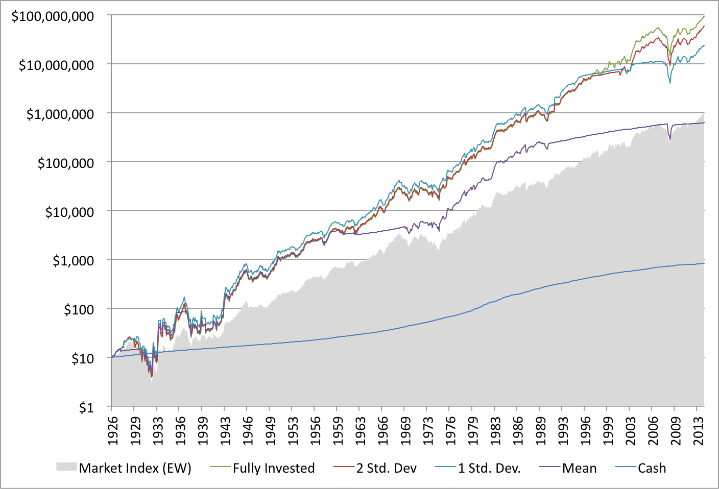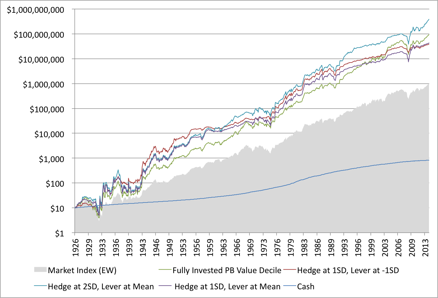 The following chart backtests three strategies. The first–“Sell at 1SD, Buy at -1SD”–buys the price-to-book value decile only if the Shiller PE is one standard deviation below its mean, sells into cash if the Shiller PE is more than one standard deviation above its mean, and holds cash until the market falls back below one standard deviation below the mean. The second–“Sell at 1SD, Buy at Mean”–buys the price-to-book value decile only if the Shiller PE is below its mean, sells into cash if the Shiller PE is more than one standard deviation above its mean, and holds cash until the market falls back below the mean. The third–“Sell at 2SD, Buy at Mean”–buys the value decile only if the Shiller PE is below its mean, sells into cash if the Shiller PE is more than two standard deviations above its mean, and holds cash until the market falls back below the mean.