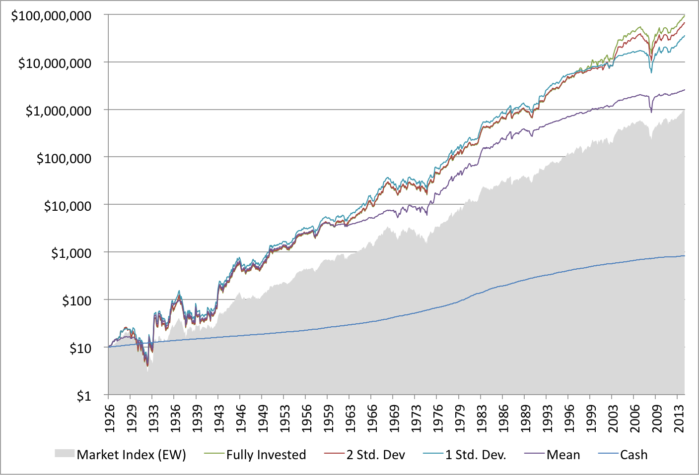 I received a number of emails asking me to revisit the backtests from last week’s post about using the Shiller PE to time the market (Worried about a Crash? Backtests Using Shiller PE to Time The Market (1926 to 2014)). The most common request was to separate the buy and sell rules such that if the strategy sold out at say one standard deviation above the mean, it didn’t buy back until the Shiller PE fell below its mean. The second most common request was to alter the strategy such that it hedged out the market rather than switching to cash.