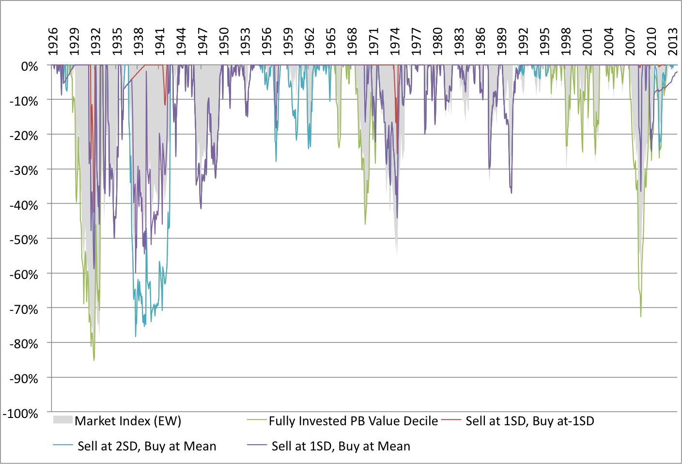 Graham Rule: Drawdowns of Value Decile (Price-to-Book Value), Cash and 3 Shiller PE Timed Strategies (1926 to Present)