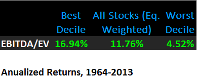 This is a great multiple for stock selection. Like to price-to-earnings ratio, it helps you find unloved companies, but it also penalizes stocks for having too much debt (more debt = worse ratio, ceteris paribus). If all you did was buy the 10% of stocks with the cheapest EBITDA/EV ratios on an annual basis, you’d have outperformed the market by more than 5% annually over the past five decades.