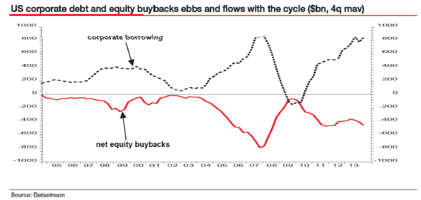And this, note, is after years of record profits. Companies have used their profits, and their borrowings, to drive up their own stock prices.