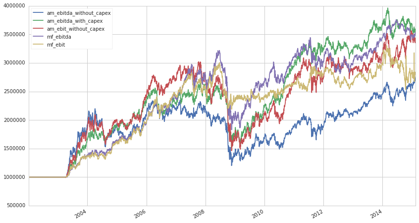 They tested a few variations of operating earnings, including EBIT, EBITDA, and EBITDA – Cap Ex. The results were recorded in their notebook, which you can view on the site by clicking here and finding the red “View Notebook” button to the bottom right of the first screen. Here are some of the backtest results: