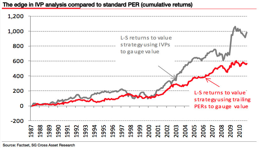 1. I’m not sure that his Magic Formula weighting is genuine “value” weighting. Contrast Greenblatt’s approach with Dylan Grice’s “Intrinsic Value to Price” or “IVP” approach, which is a modified residual income approach, the details of which I’ll discuss in a later post. Grice’s IVP is a true intrinsic value calculation. He explains his approach in a way reminiscent of Buffett’s approach: